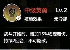 战斗开始时,增加15%物理增伤,持续2回合,不可驱散。配合蕾温二技能达到第三级伤害叠加到了217%对后排威胁极大。