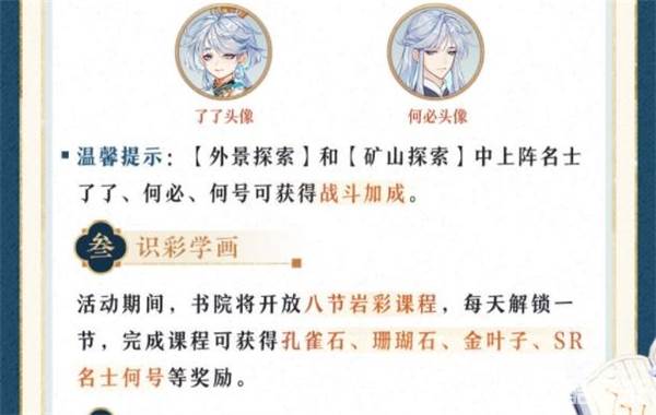 2、其中玩家可以通过参加【识彩学画】来得到SR名士何号等奖励。