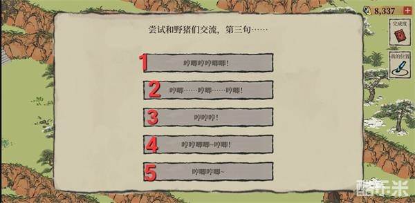 1.徽州府探险第一章之和猪猪们对话,一共5句,选错了就要从第一句重新开始。