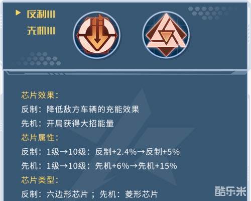 配置建议:“反制芯片”所占据的六边性孔位使其适合很多拥有双六边形孔位的干扰车装配,能够达到明显的遏制敌方车辆大招充能的干扰效果,例如S7赛季黑金会员车辆逐浪是装配反制芯片的不二之选,类似机械咆哮虎、魔鬼鱼等也都能够在装配反制芯片时发挥出更为亮眼的赛场表现!