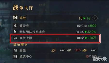 每日可夺取的资源总量存在上限,基础30万,之后可通过升级战争大厅提升上限。玩家可以通过点开领地,查询资源夺取上限