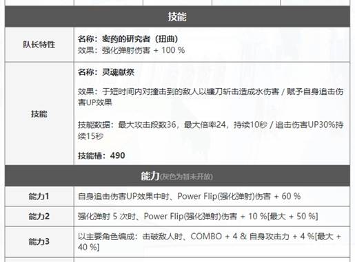 队长为火属性角色时,每次自身技能发动后,3.75秒内PowerFlip(强化弹射)伤害+12.5%
