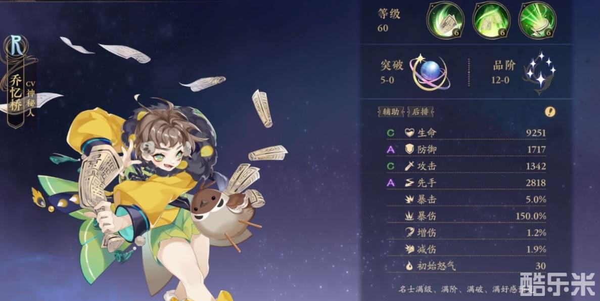 【一马当先】:该技能在游戏内相当特殊,可以增加自己100%的先手值,这就基本上决定了每一回合都是乔忆桥率先发动攻击,不过被动以及普攻都没有增益效果,所以乔忆桥还是依靠大招为主的角色,所以实战当中还是需要回怒角色进行辅助。