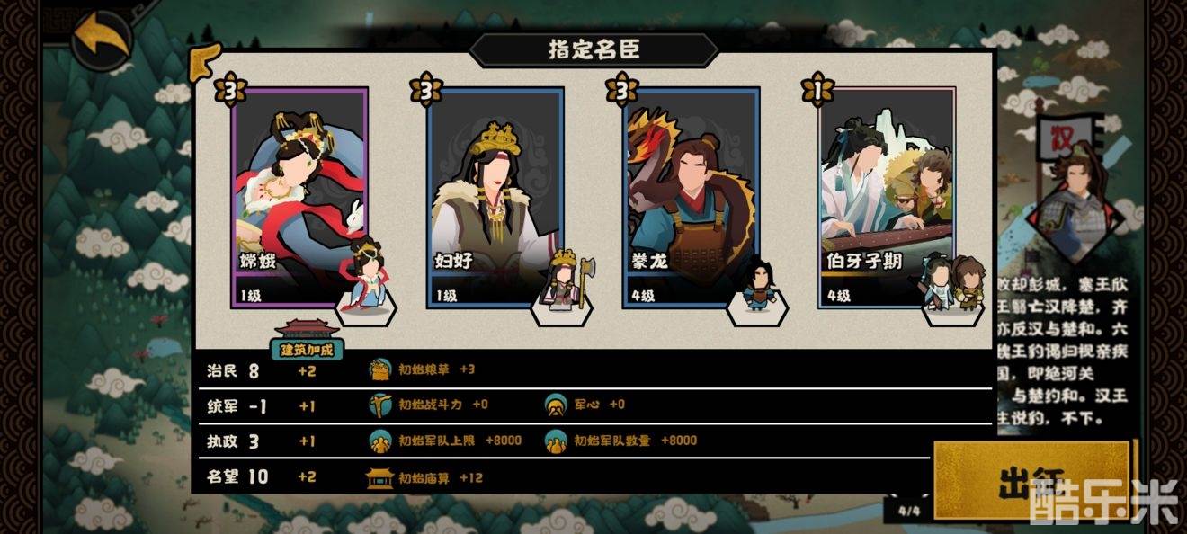 秦楚汉的萧何、吕雉组合依然是不变应万变的存在,由于升规模后期需要大量粮草,因此如果没有这俩,名臣也要以发育为主要方向。
