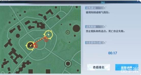 具体方法为:在①号点接受试炼后,马上使用能力【流光】第一个技能急速,目的为有效提高移动速度。当冒险家们快速移动到②号点位置后,立马使用喷气背包(距离建筑物越近越好,离得越近,越能接近终点)飞向目的地,在接近圆环之巅时,立马连蹦带跳奔向终点即可。