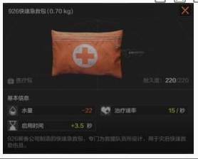 926急救包的耐久度是220,对比上面两种药品,这个药品的恢复健康程度可以说是相当高了,治疗速率15/秒,启用时间3.5秒,减少人物水量22。