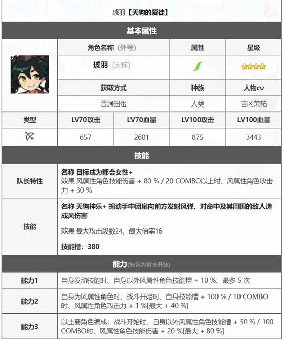 能力2提供自身满充的同时能力3也给风队提供全队的50充能,加速了风队的开局启动能力。与此同时能力1在自身释放技能时给予全队充能回转。一个四星角色,融合了启动和回转,提供不低的技伤和攻刃加成,主动技能也提供了高额的连击数。一切的一切都明示了琥羽是风队的核心。