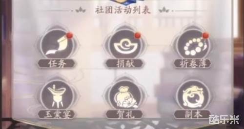 目前社团活动一共有6个项目,分别是任务,捐献,祈福薄,玉棠宴,贺礼以及副本这六种活动。玩家可以通过参与这六种活动来获取相应的社团奖励。