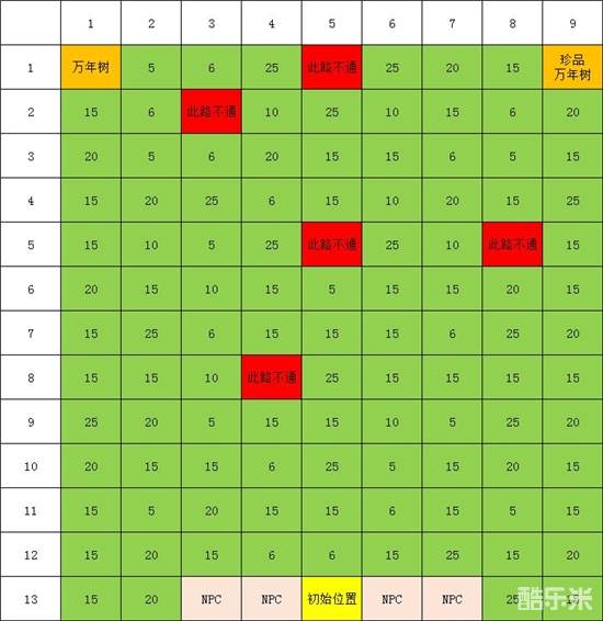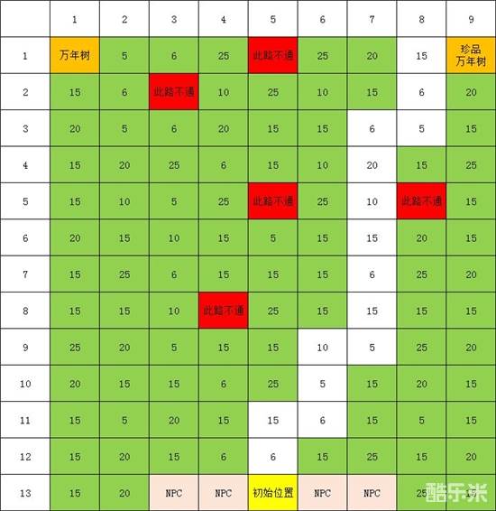 根据上图,可以找到消耗元宝最少的路线,珍品万年树的路线为: