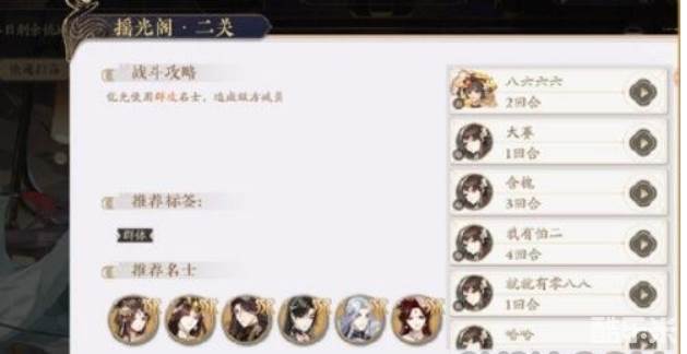 天璇阁:通关摇光阁后解锁,难度较高,奖励更丰厚。每关需要战斗两次,且每场战斗需要使用不同名士,因此推塔至少需要12位练度较高的名士。