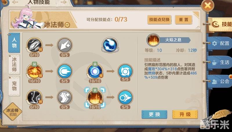 冰法师栏中暴风雪、寒冰宝珠进阶、霜冷刺骨都尽量在5+5的基础上加满。生命属性部分则随意。