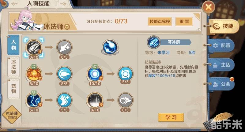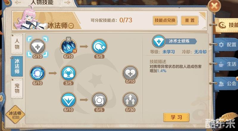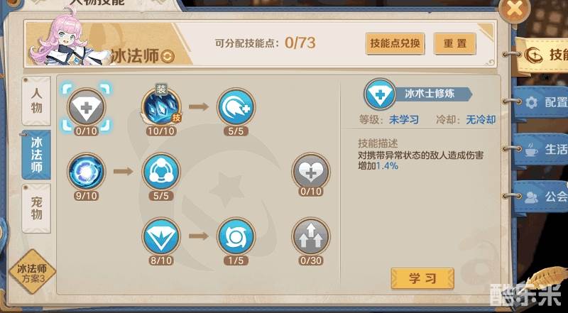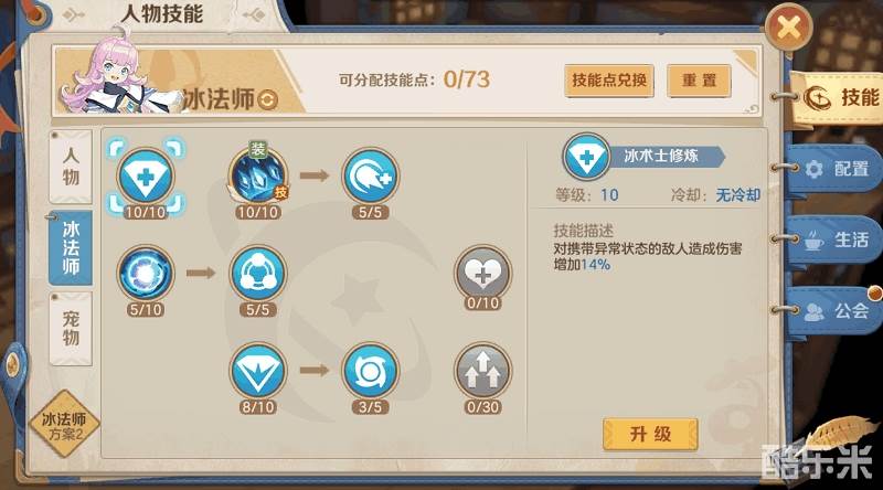 冰法师栏:冰术士修炼加满10。暴风雪加满10/5。寒冰宝珠进阶5/5。霜冷刺骨和冰霜护盾加满10/5,点数不足则优先霜冷刺骨。