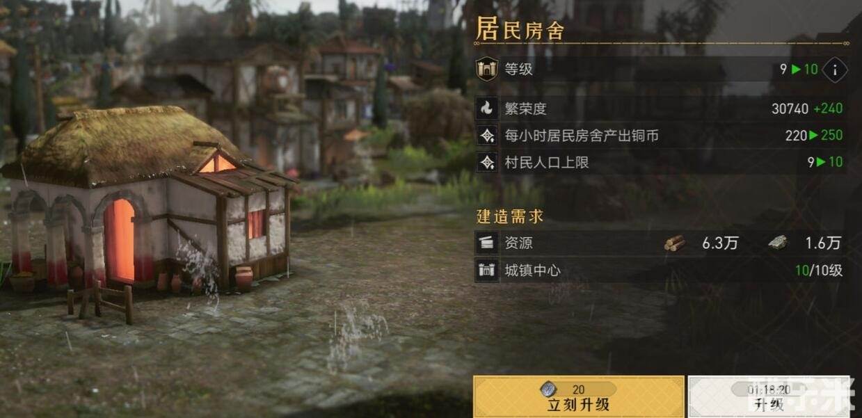2、第一个对应的是居民房舍,升级居民房舍能够解锁村民人口上限;