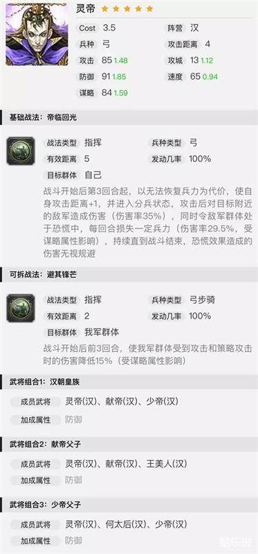 可以说正是这两个战法的存在让灵帝可以物法双修,恰当的用好了他的水桶三围。因此对于谋略流灵帝,“火积”、“强攻兵法”和“穷追猛打”,这三个技能一个都不能少,少了的话建议还是玩物理流。至于还有种纯谋然后带“四面楚歌”、“声东击西”的法系玩法,我在这里并不建议,因为如果那样的话,还不如用正统法系武将,【谋略】成长更高。