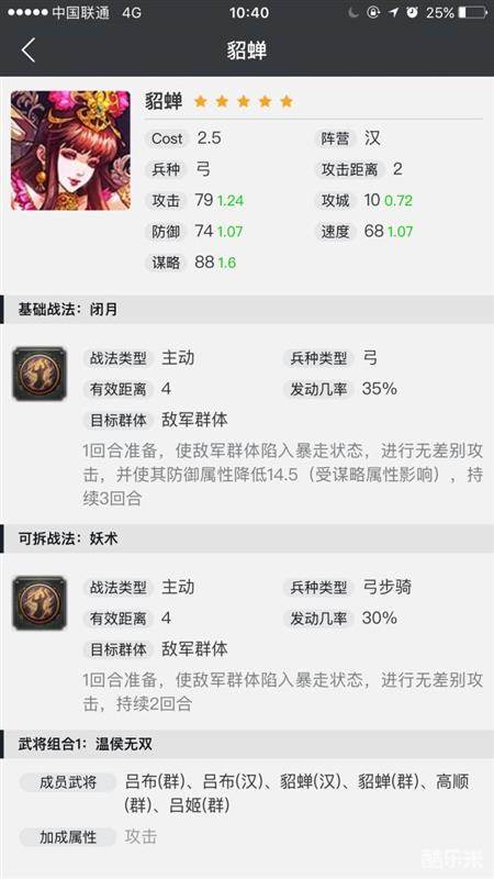 再来说搭配,辅助类技能+短攻击距离,决定了貂蝉不可以作为大营将使用。而如果将防御值略低的貂蝉作为前锋,那将战损惊人,因此貂蝉大多数时候只能作为中军了,但是如果想要强行给她“坚守”战法,做前锋也不是不可以,取决于阵容搭配。另外考虑到技能的防御降低效果,能配合物理将是最佳的。而另外一方面,低概率的不稳定控制,最好能够给予足够的回合数来释放才能体现效果。也因此,大营用灵帝这样的后期输出挺不错,而前锋最好有足够的团队减伤来给予整个队伍拖后期的能力,比如何太后。