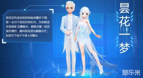 昙花花色渲染的男性西装裁成瓣状下摆,取一朵月下昙花印刻在内,为你建造永恒国度;而女装花瓣做衣,裙摆点缀一层淡紫薄纱,腰间昙花透出朦胧光芒,似是月下仙子不食人间烟火。