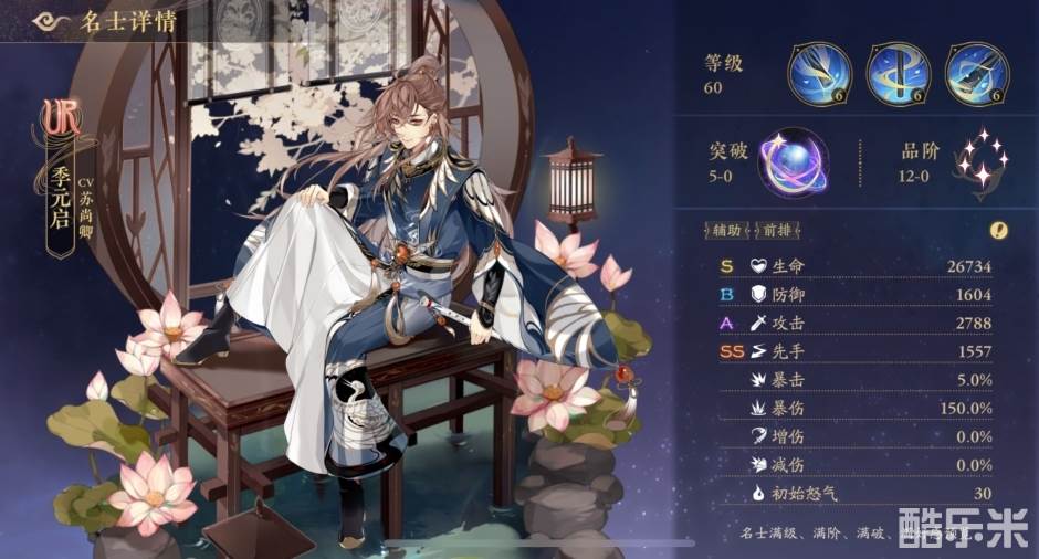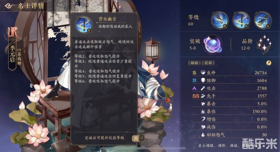 鼓鸣:在鼓鸣状态下使用怒气技能时,提升全体队友10点怒气,回复全体名士季元启攻击力50%的生命并提升全体名士10%伤害,持续2回合,无法驱散。