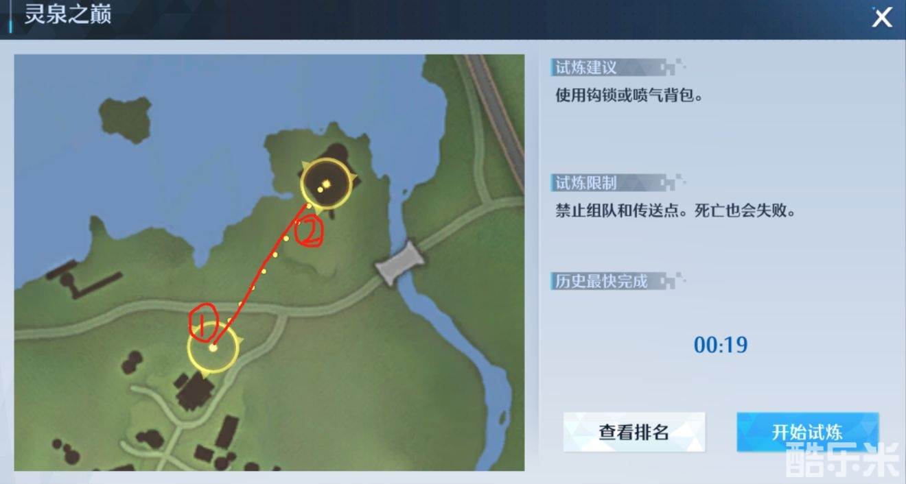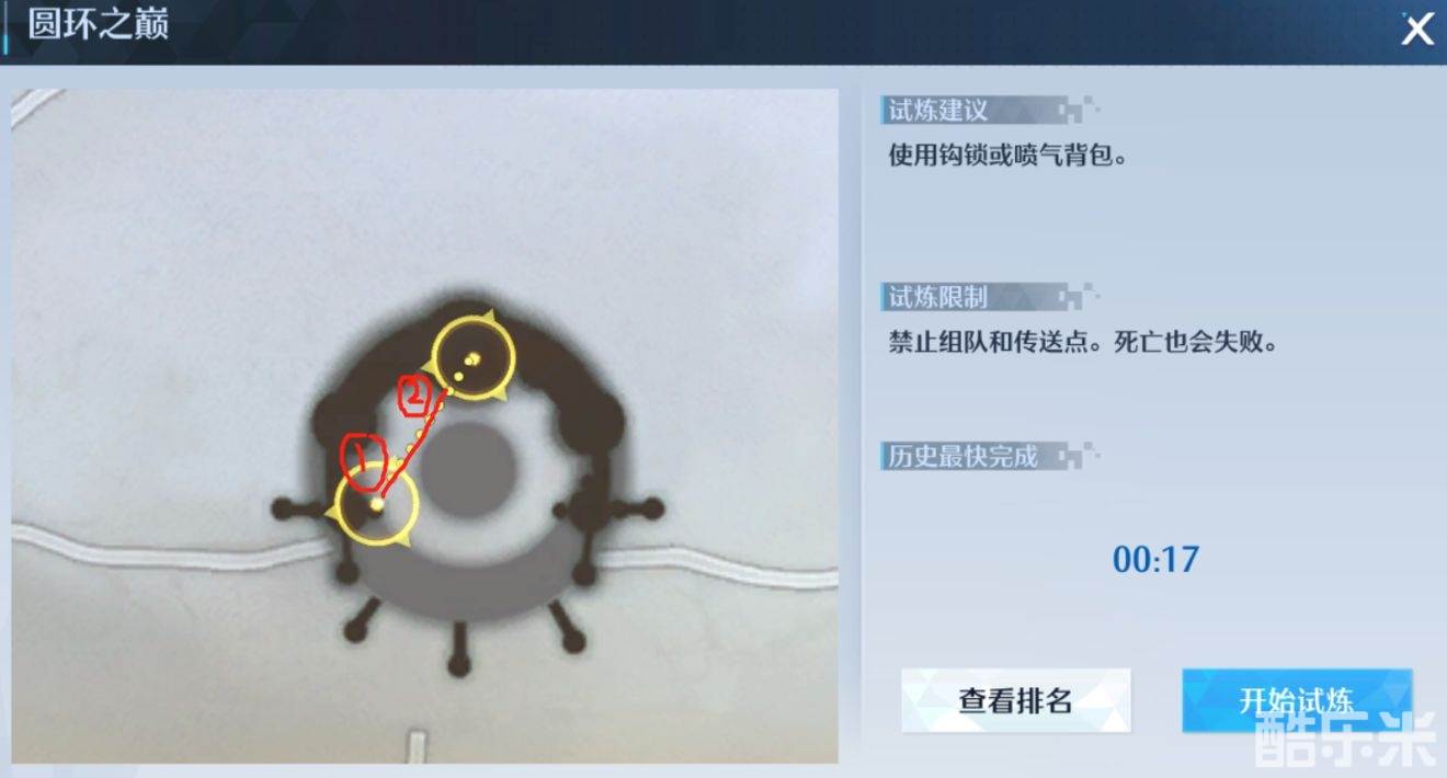 具体方法为:在①号点接受试炼后,马上使用能力【流光】第一个技能急速,目的为有效提高移动速度。当冒险家们快速移动到②号点位置后,立马使用喷气背包(距离建筑物越近越好,离得越近,越能接近终点)飞向目的地,在接近圆环之巅时,立马连蹦带跳奔向终点即可。