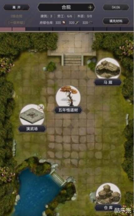 在集市购买少量木头、砂石、铁矿和一级地契:合院,前往草庐造房子,升至十级草庐后可使用地契将草庐升为合院,开启演武场和马厩。