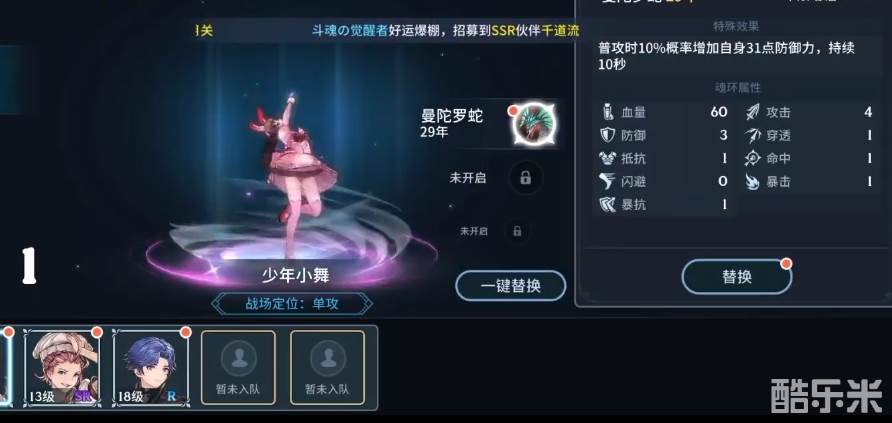 小舞在游戏中的定位是一个输出,柔骨兔的武魂让小舞拥有比较强势的单体爆发能力,战斗中不管是普攻还是技能,都能够对敌人造成不错的暴击伤害。在面板上小舞的攻击力和暴击也不低,队伍的配置除了要发挥小舞的优势之外,还要弥补小舞的缺陷。
