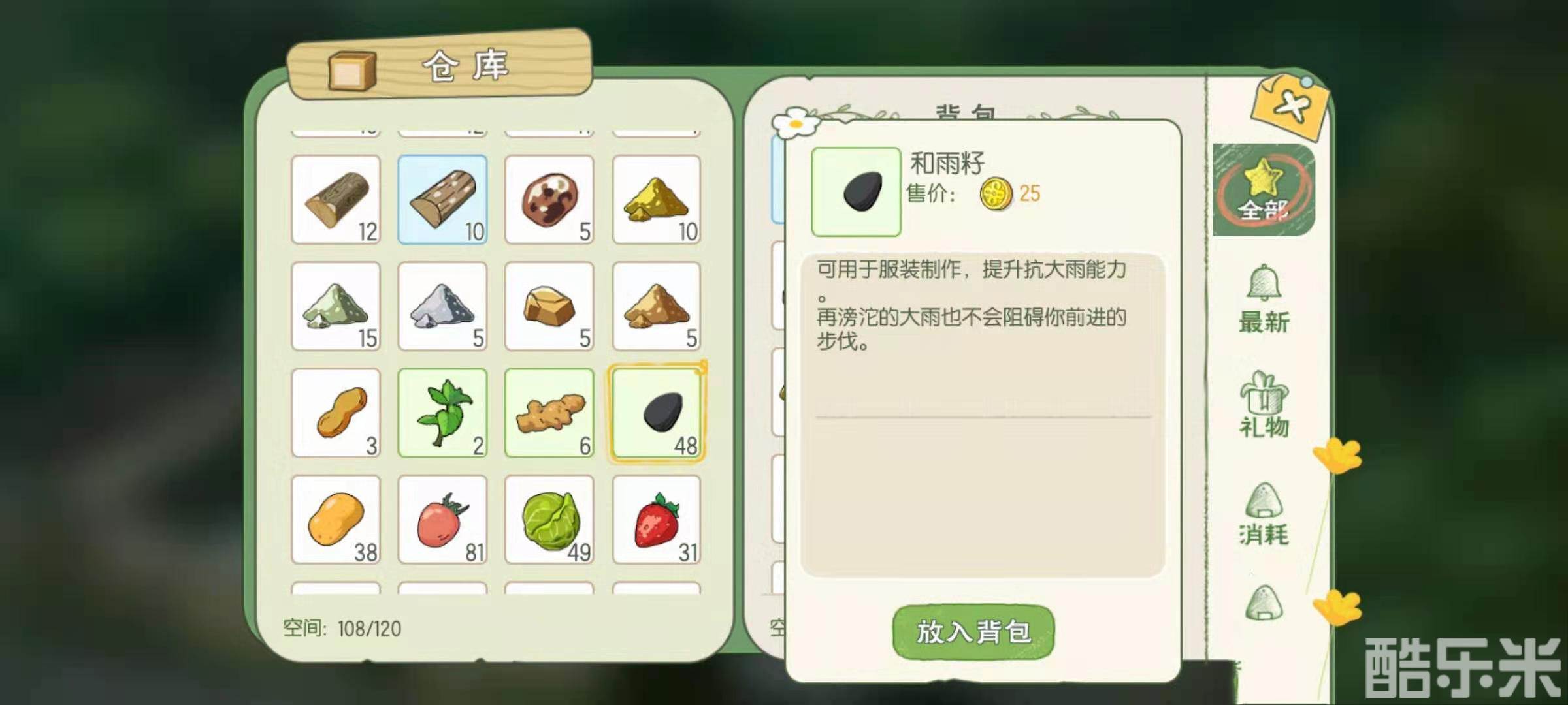 穿着雨衣可以增加抗雨属性,也就是在下雨天出门可以减少体力流失,想要制作一件漂亮的雨衣需要2个兔绒卷、3个和雨籽、1个砂白树脂。