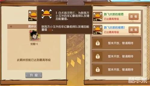 蓝色羁绊效果的触发条件是狛犬首次死亡,具体效果是:为除我方小玉外的非幻象前排队友增加能量值,满级6级增加能量值:180。显而易见,小玉的上阵搭档就是路飞太郎。