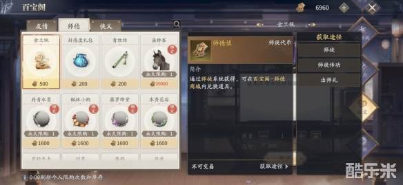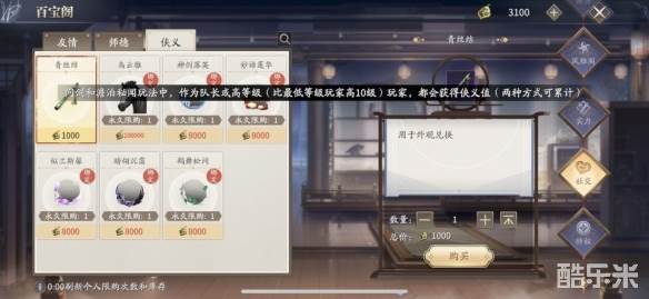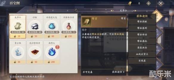 (1)百宝阁商店:分为每日限购、每周限购和不限量三类,在帮贡不足的情况下,建议优先兑换间客体力(每周限购5)>