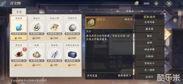 平级选择:内库珍宝(每周限购100) = 内功心得(每周限购100) = 星魄石(每周限购400)。