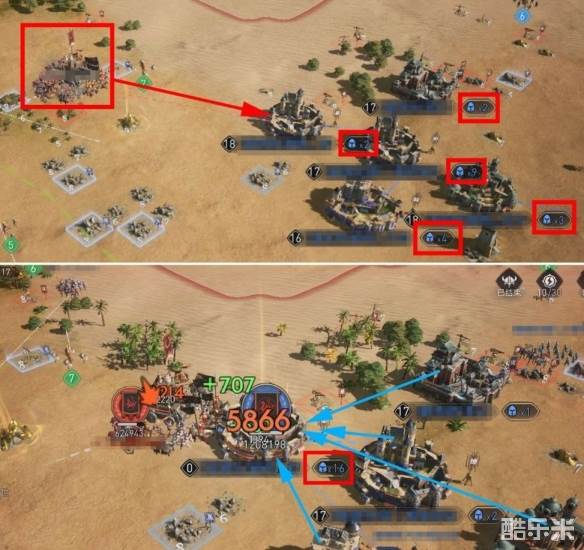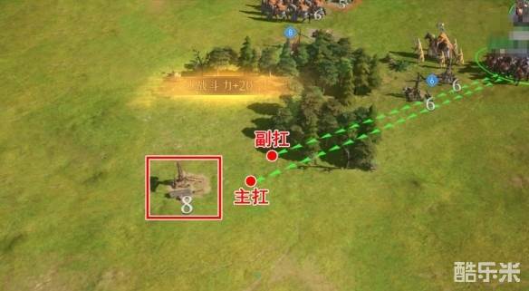 实战中可以一前一后的方式行军,主扛队伍落位点靠近目标资源田,副扛队伍稍稍往后,随后点击资源田同时进攻,蛮族会自动攻打先接触的主扛队。