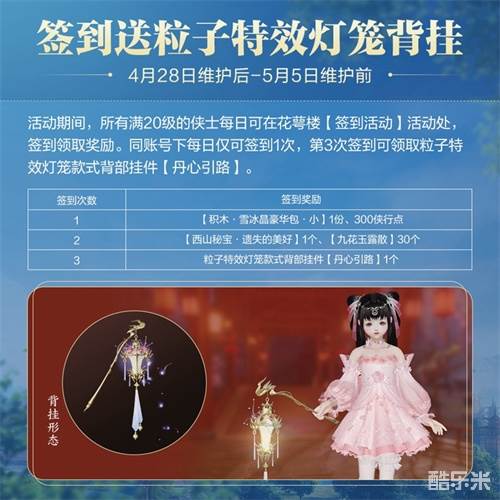 随着新资料片的开启,全新粒子特效背部挂件签到即可带回家!今日维护后至5月5日维护前,所有满20级的侠士登录游戏后,可前往运营活动界面“花萼楼”签到领取“积木·雪冰晶豪华包·小”、“西山秘宝·遗失的美好”及粒子特效灯笼款式背部挂件“丹心引路”等诸多好礼!
