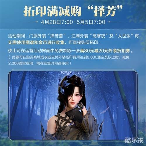 喜迎新赛季,“择芳”套免图谱收集进行中!今日起至5月5日7:00期间,“择芳”套与上赛季江湖套无需消耗图谱和金币即可收集!除此之外,每个角色均可前往“花萼楼”活动界面领取一张满8000通宝减2000通宝的折扣券。