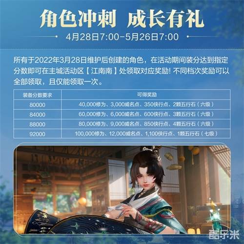 新资料片今日正启,江湖也迎来更多新侠士,暖心奖励助力侠士快速成长!所有在2022年3月28日7:00后创建的角色,在今日起至5月26日7:00期间,装分达到指定分数后即可在主城活动区【江南南】处领取对应奖励!