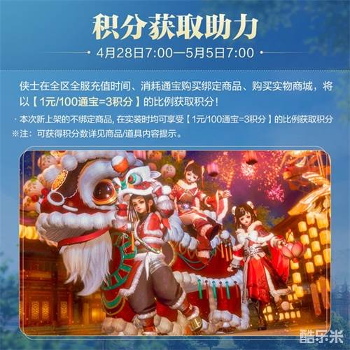 福利优惠又添新意,充消积分三倍回馈!今日起至5月5日7:00期间,侠士在全区全服充值时间、消耗通宝购买绑定商品、购买实物商城,将以【1元/100通宝=3积分】的比例获取积分!