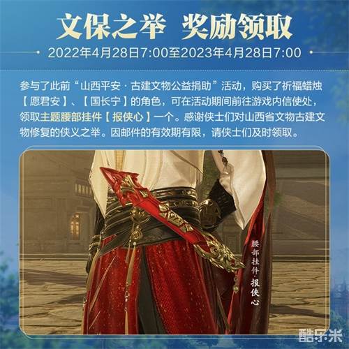 文保之举塑侠义,感谢侠士们对于山西玉皇庙文物保护工作的大力支持,我们为大家送上了全新的文物公益捐助挂件奖励!即日起至2023年4月28日7:00期间,此前购买了祈福蜡烛【愿君安】、【国长宁】的角色均可在活动期间前往游戏内信使处领取主题腰部挂件“报侠心”,以表《剑网3》对各位侠士侠义之举的真挚感谢,未来我们也将继续吸取此类珍贵文物的艺术元素,在游戏内设计更多传承中华传统文化的佳作!