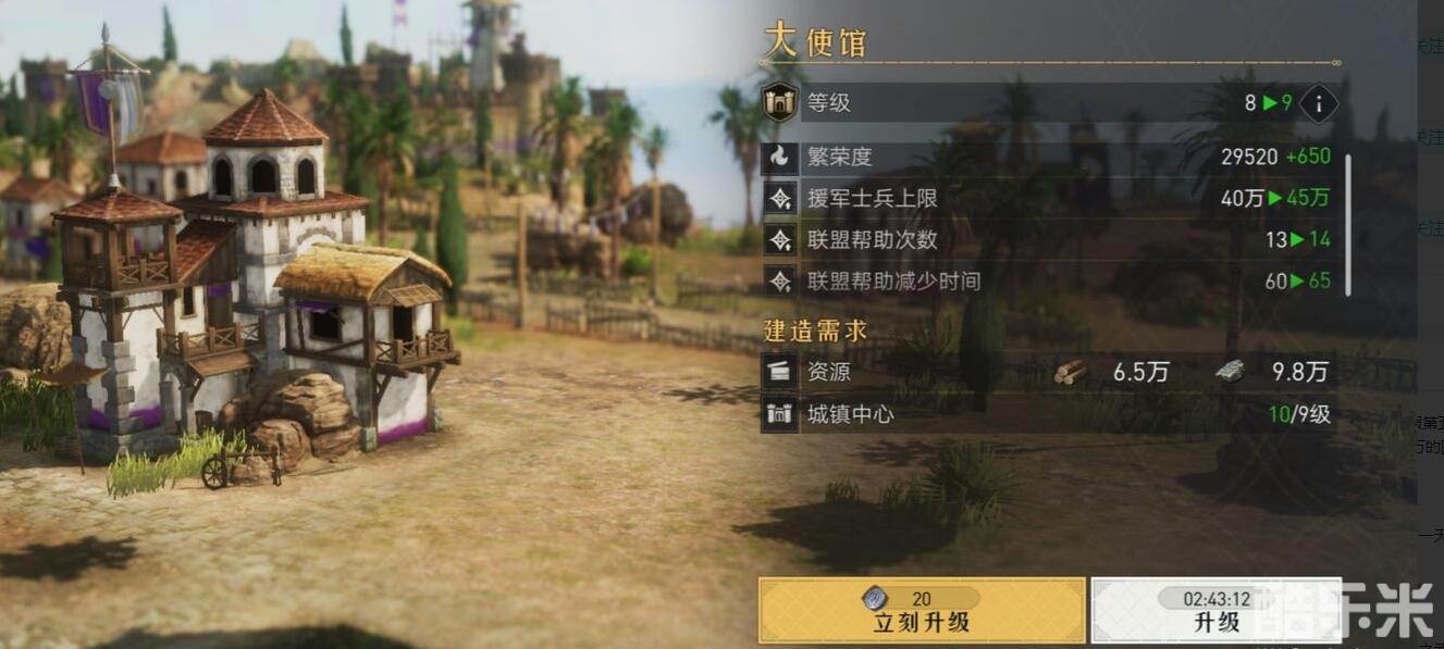 大使馆升级所提升的,是联盟支援以联盟帮助的时间和次数,将它提升到一定等级后,会对你后续的建设速度有不小的提升。