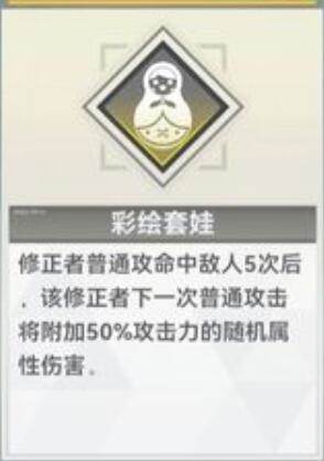彩绘套娃的效果为:修正者普通攻命中敌人5次后,该修正者下一次普通攻击将附加50%攻击力的随机属性伤害。