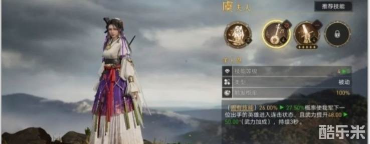 副将3号位,固有技能美人恩可给主将武圣提供连击状态,且提升大量武力值;初期可选择破怒斩、撕裂等四星技能过渡。