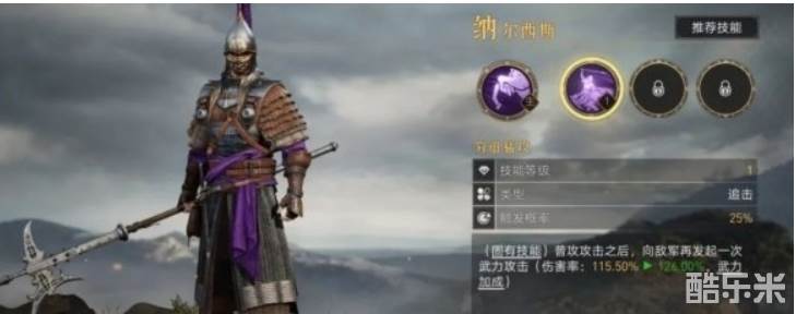 固有技能凶猛追击在输出之余可提升自身武力伤害;三星技能可装配二连斩或冲击,四星技能可选连击、撕裂等。