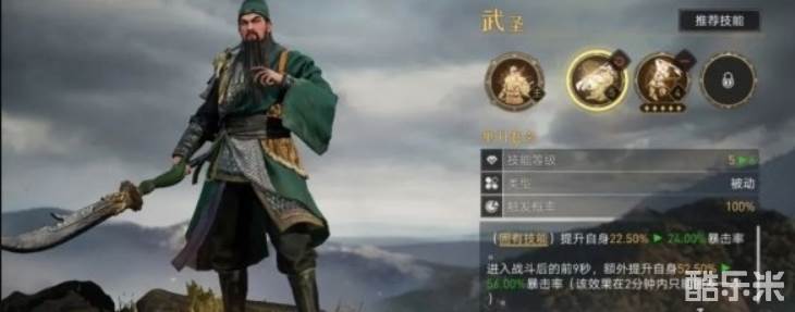 主将位,主将技青龙偃月在造成伤害之余,可提升100%暴击率;固有技能单刀赴会可大幅提升自己暴击率。