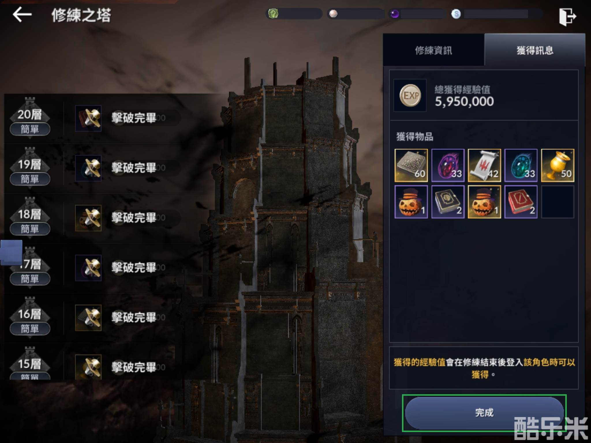 - 可以确认击破修练之塔所获得的经验值、奖励
