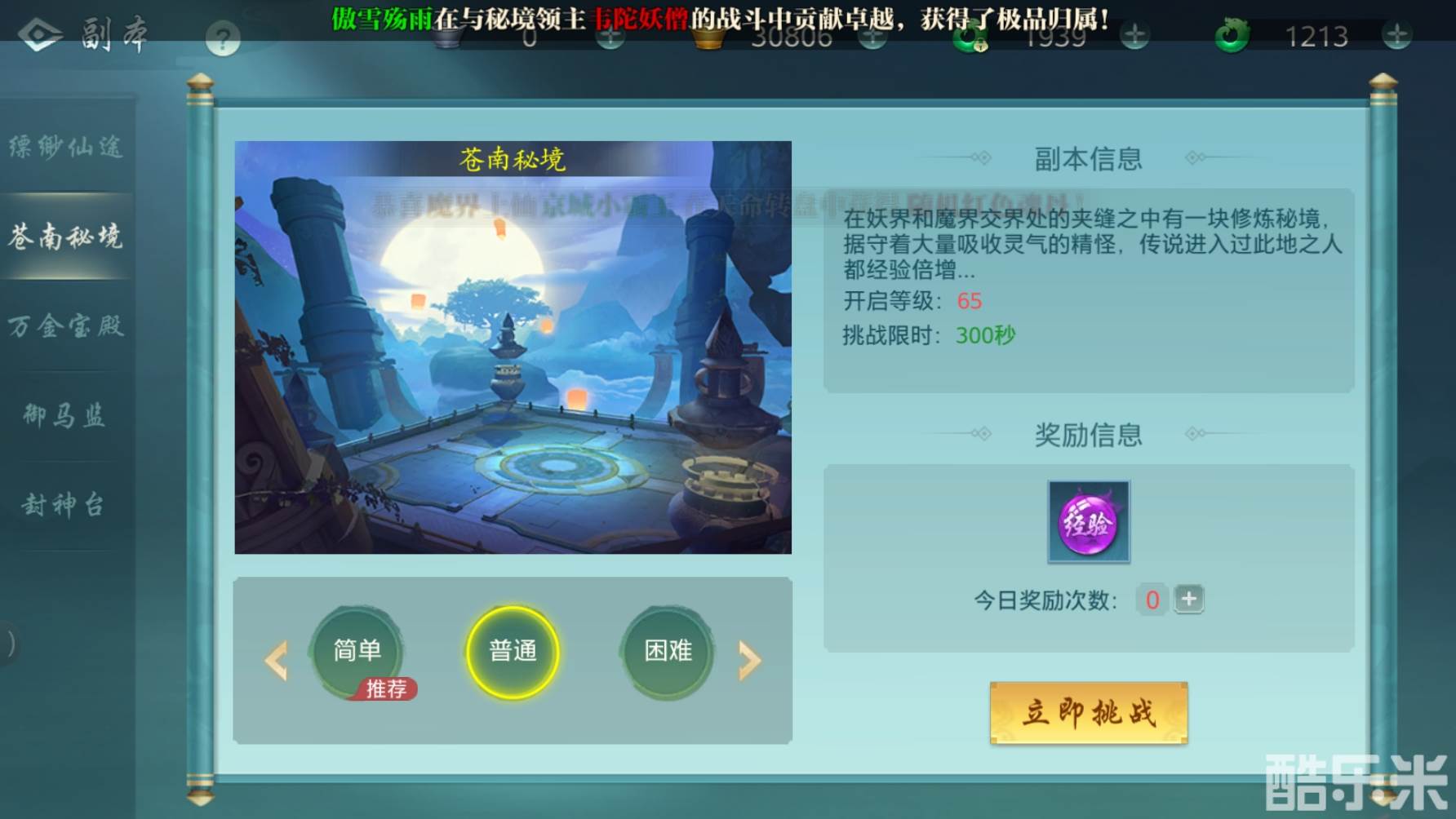 进入苍南秘境副本,可以获得海量的经验奖励。