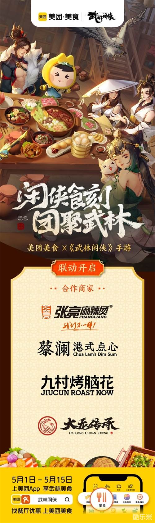 武林美食盛宴即将开启,《武林闲侠》手游联动美团美食,携手蔡澜港式点心、张亮麻辣烫、九村烤脑花、大龙火锅为各位少侠带来多道独家秘制菜品。4月30日-5月6日,在联动活动中,各位少侠不仅可以亲手体验美食烹制流程,更能获得丰厚奖励!