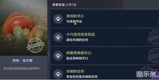 3、然后我们回到宠物界面,点击背石蟹找到与肯纳对话的任务。
