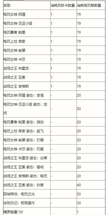 3.1张皮肤卡可兑换1款电玩系列的皮肤,一定数量的电玩券可兑换电玩系列皮肤、姿态等奖励。