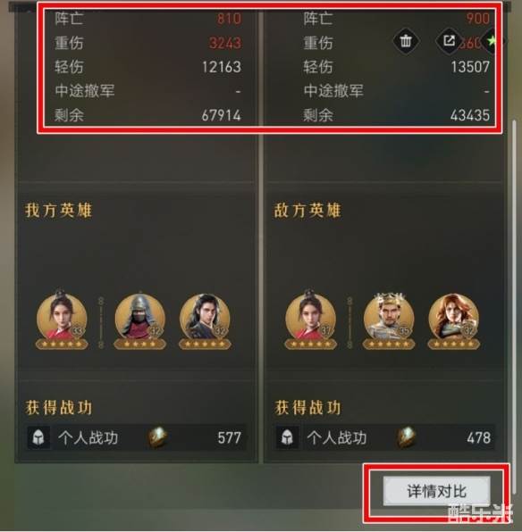 除建筑耐久类战报外,其余所有战报的首页均为敌我战损对比,从这一项可以清楚的了解双方的实力比,用以衡量接下来的作战计划,敌强则避其锋芒,敌弱则乘胜追击。
