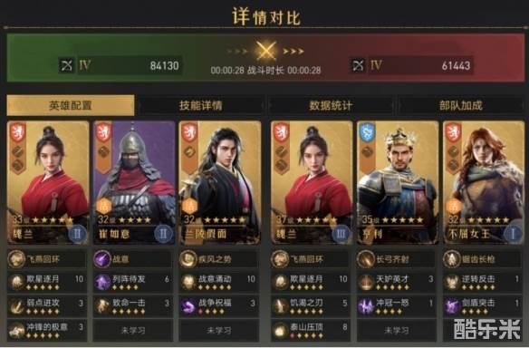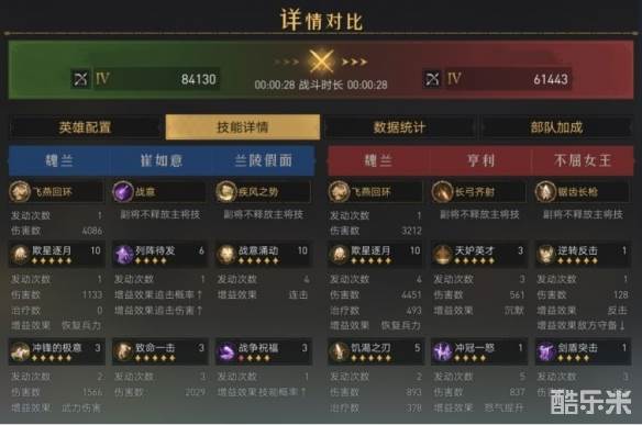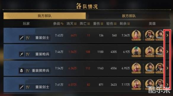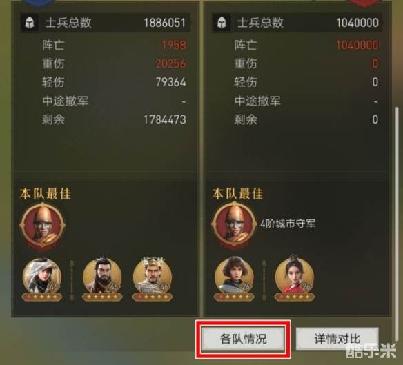 此类战报是最适合作为阵容和技能搭配的参考对象,我们点开最下方的【各队情况】选项,在这一场战斗中,所有参与领主的战损比都在此可见。