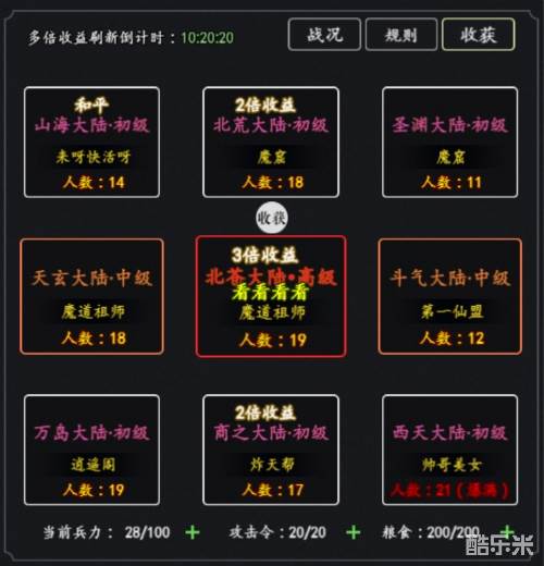 当一个仙盟把同一大陆的非本盟的道友全部打出该大陆后,可以获得占领特权,本仙盟的所有道友收益都将提升20%。