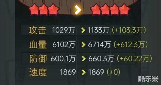 一颗皇冠之后,每提升一个星级,增加15%属性(攻击、防御、血量)。那么从一颗皇冠到四颗皇冠的属性提升为1*115%*115%*115%=1.52倍。并且四颗皇冠武将能觉醒前面两个技能(主动技能+被动1)。