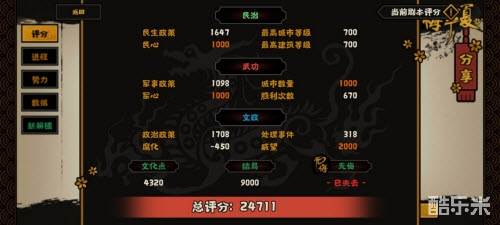 1、首先前期你叠战力没用的,我打了两遍,这个ai呢,战力是跟着你走的,你多高它多高,而且总比你高那么一点点或者很多,但是ai有两个突破口,一个是军队规模,一个是兵种等级。想玩好这个剧本,名臣方面,民生我是羲和,不为什么,就是玩的舒服。其他位置鄙人建议带个李斯韩信张良之类的,当然张良三星起步,追求高分的,军事可换白起,让你军心威望一直保持满状态,后期不管ai战力多高,你规模,兵种等级压制,它拿你一点办法也没有。