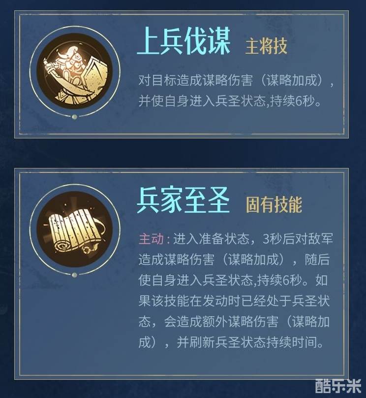 主动:进入准备状态,3秒后对敌军造成谋略伤害(谋略加成),随后使自身进入兵圣状态,持续6秒。如果该技能在发动时已经处于兵圣状态,会造成额外谋略伤害(谋略加成) ,并刷新兵圣状态持续时间。
